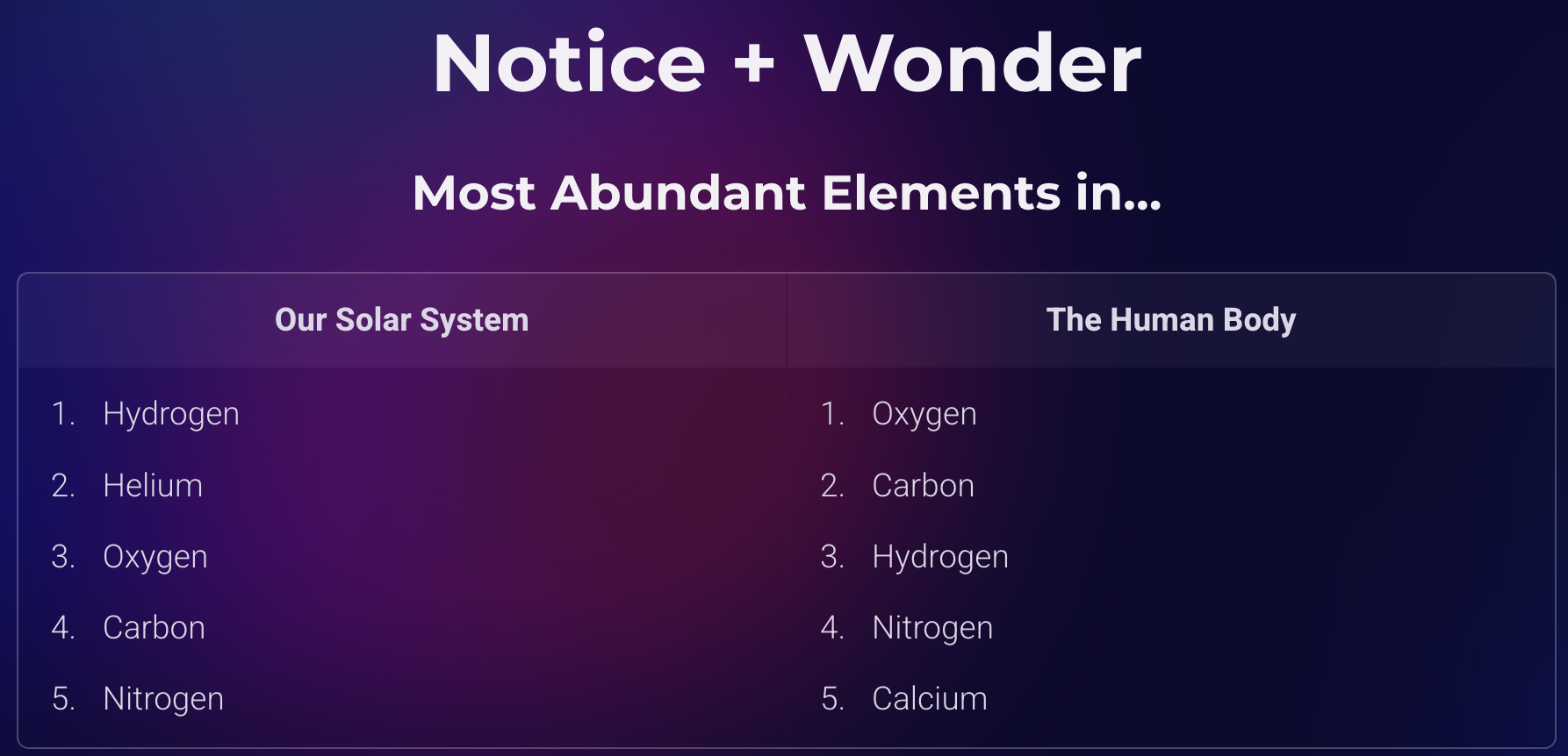 Every atom in our bodies has a history that goes back billions of years. Hydrogen, a remnant of the Big Bang, flows in our veins as part of water. Carbon, created in the cores of ancient stars, forms the backbone of our DNA. Oxygen, born from stellar fusion, helps us breathe. Nitrogen, forged in dying stars, is essential to our genetic code.
